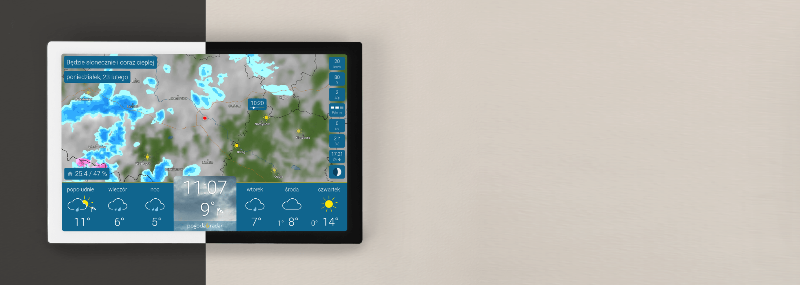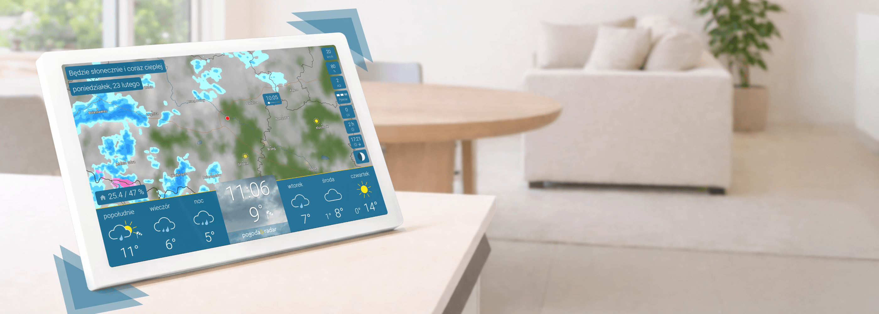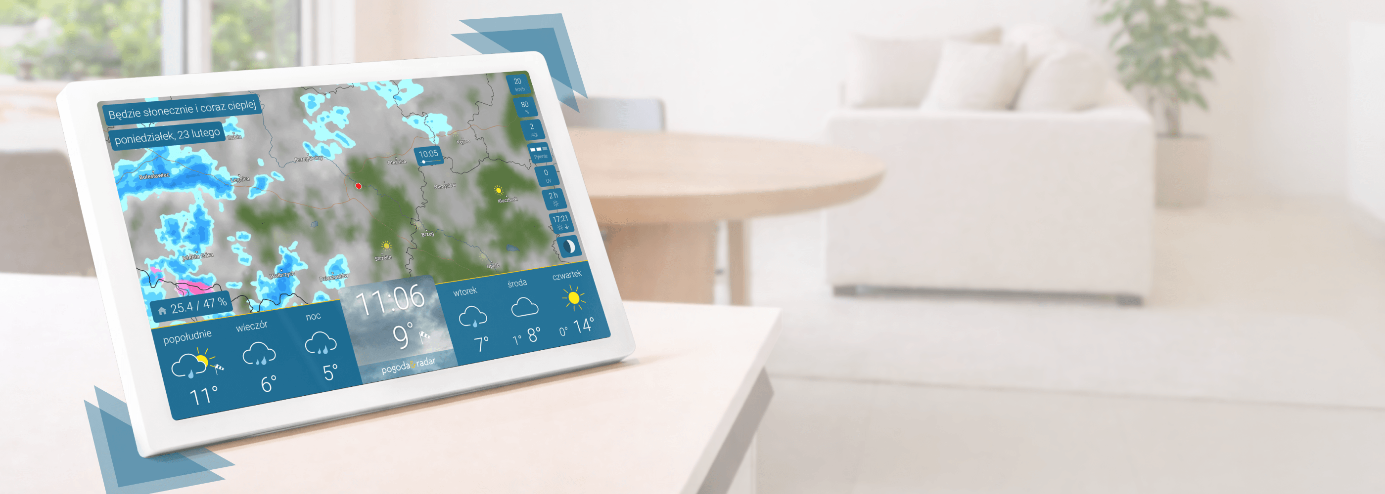 pogoda & radar home wyświetla radar pogodowy na żywo na kolejne 90 minut - idealny, by z wyprzedzeniem sprawdzić, czy zbliża się deszcz lub burza. Jako cyfrowa stacja pogodowa z Wi-Fi zapewnia dokładne dane w czasie rzeczywistym bezpośrednio od Pogoda & Radar. Doskonałe rozwiązanie dla biegaczy, osób dojeżdżających do pracy, spacerowiczów oraz wszystkich, którzy na co dzień potrzebują szybkich i wiarygodnych informacji pogodowych.